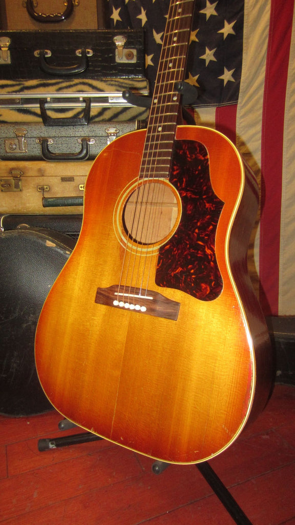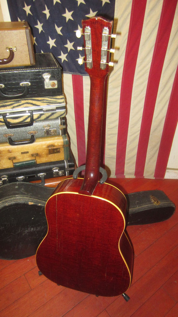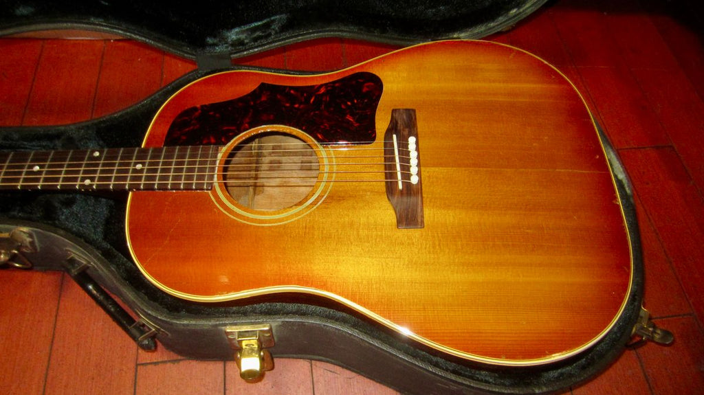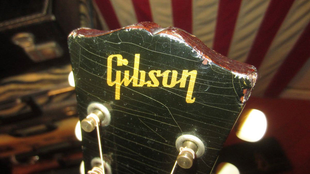 There's one or two small professionally repaired top cracks, and a couple larger repaired cracks on the back.  They were professionally repaired and it's common on any vintage Gibson.