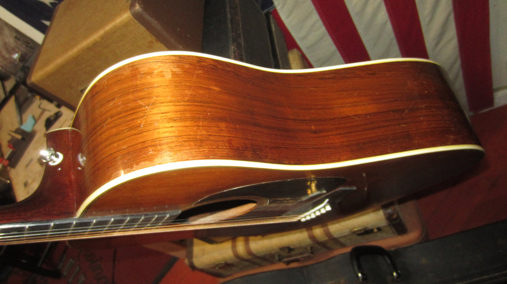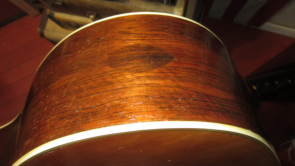 She has had a professional neck set so she's playing with a perfect action. A few small filled holes on the top upper bout from buckshot, the guitar was at one point hit with the fallout from a shotgun, which left a few tiny holes in the top which were professionally filled. Not the first time we have seen this. Adds to the vibe and look of her and though I'm sure she didn't deserve it she survived and has more songs and tales to tell as a result.