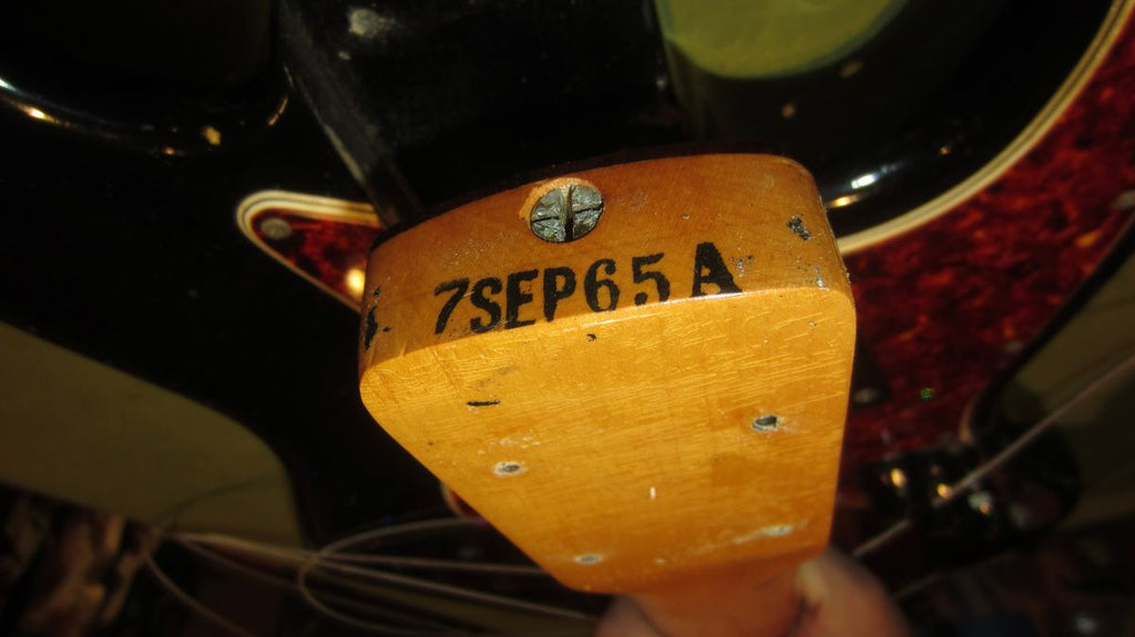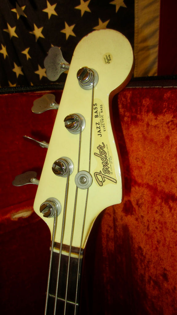 This bass is completely original with the exception of the body refinish. It appears the white headstock is original. The neck date is 7 SEP 65 A. It's an original A neck Jazz Bass. The neck is straight and plays fantastic with a good and low action. It is clean and has been well cared for.