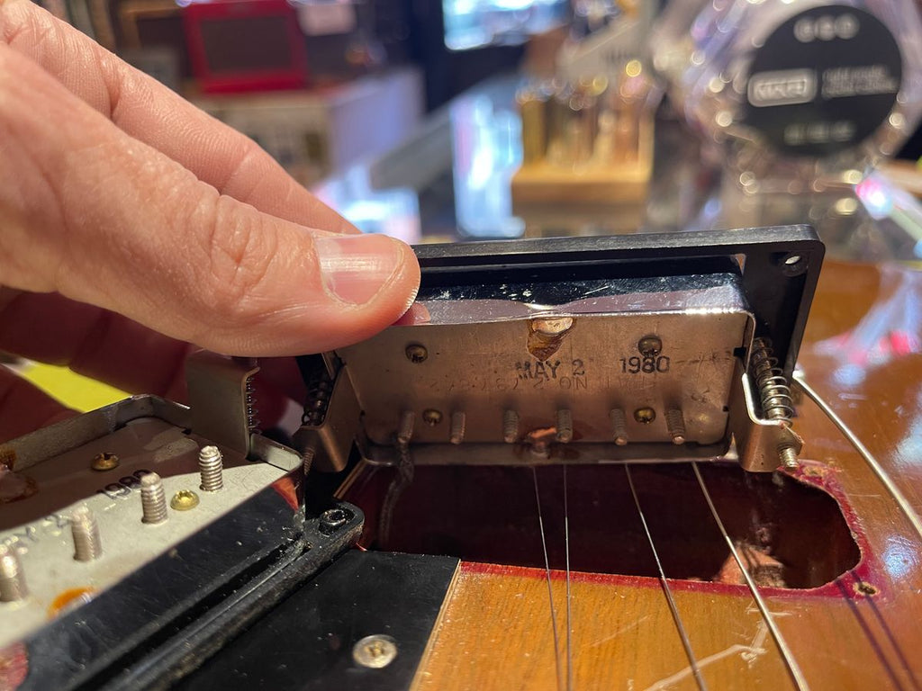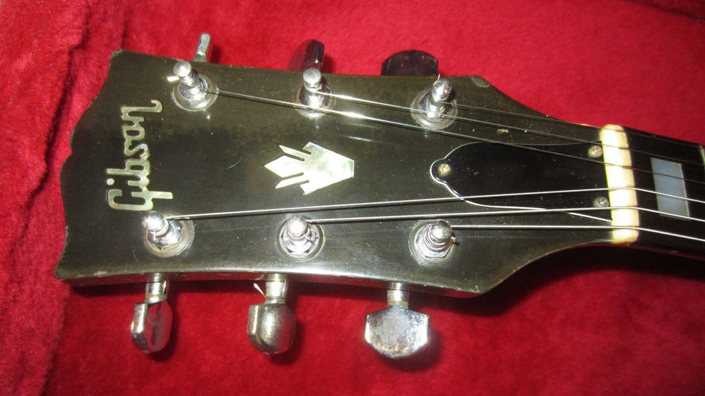 This example has a repaired headstock hence the nice price. The rest of the guitar is original though the pickups are form 1980, they are the same type of Gibson T Tops that were in the guitar originally. The pots are 1980s as well....it seems like the electronics were replaced with original type of pickups and pots from the 1980s.