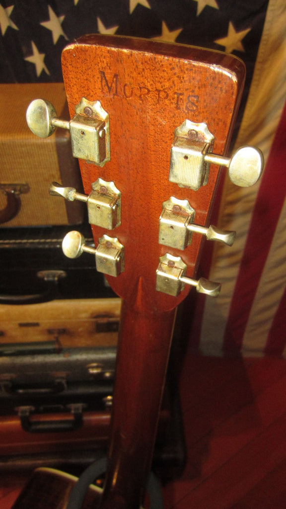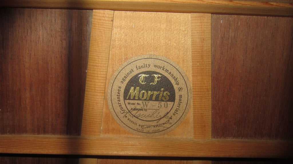 Headstock: Dark rosewood veneer with a vertical TF Morris logo and a Martin-style volute