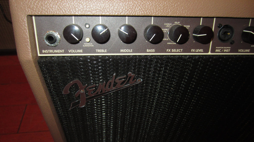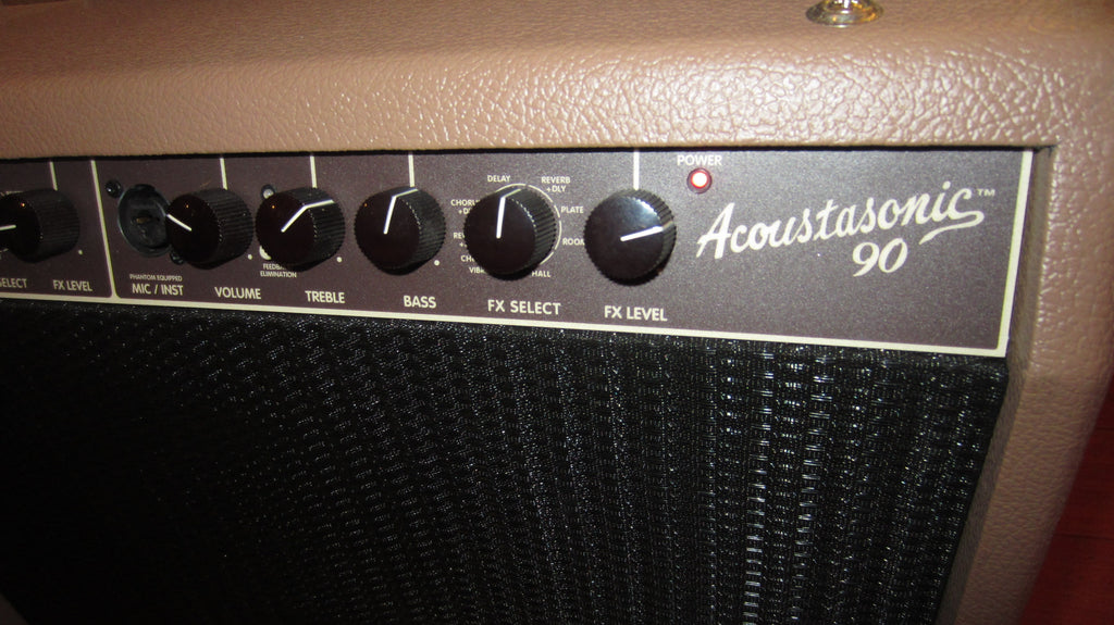 Fender's Acoustasonic 90 Combo acoustic guitar amplifier has all the features you need to get through any acoustic gig in style. The Acoustasonic 90 Combo is perfect for singer/songwriters too, thanks to its separate microphone and instrument inputs. You can plug in both your instrument and a microphone, for an instant solo PA. Or, plug instruments into both channels. You get great-sounding effects, and a balanced line out for more flexibility. Feeback-elimination controls keep the 90-watt Acoustasonic 90 sounding great even at higher levels. Great for recording and gigging and playing in your apartment.