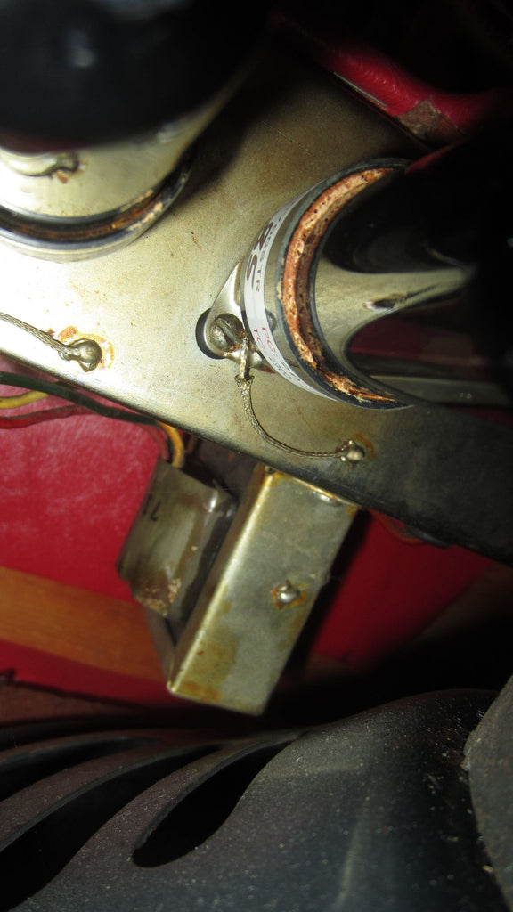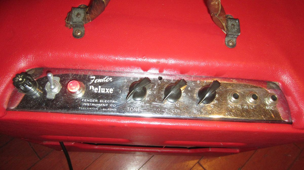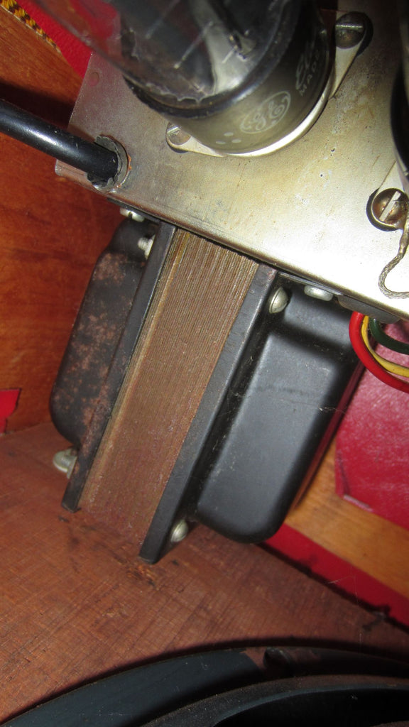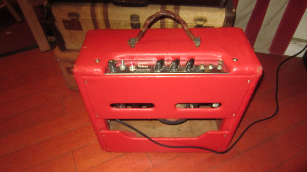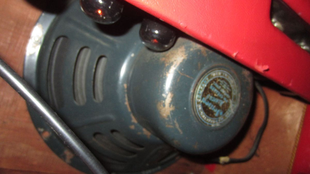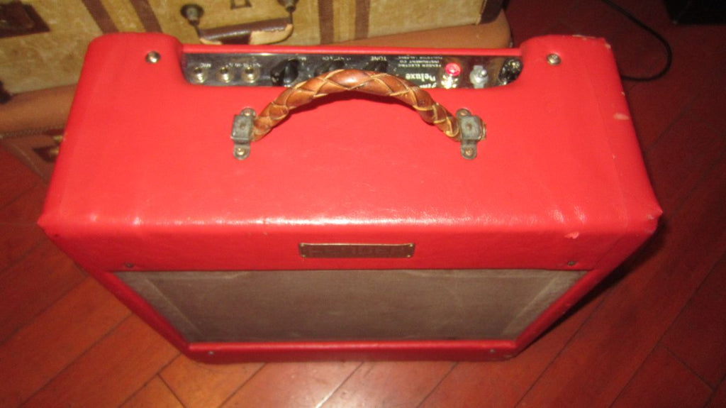 Covered in a Red tolex, which is not original but very very cool looking! Cool leather handle, too.