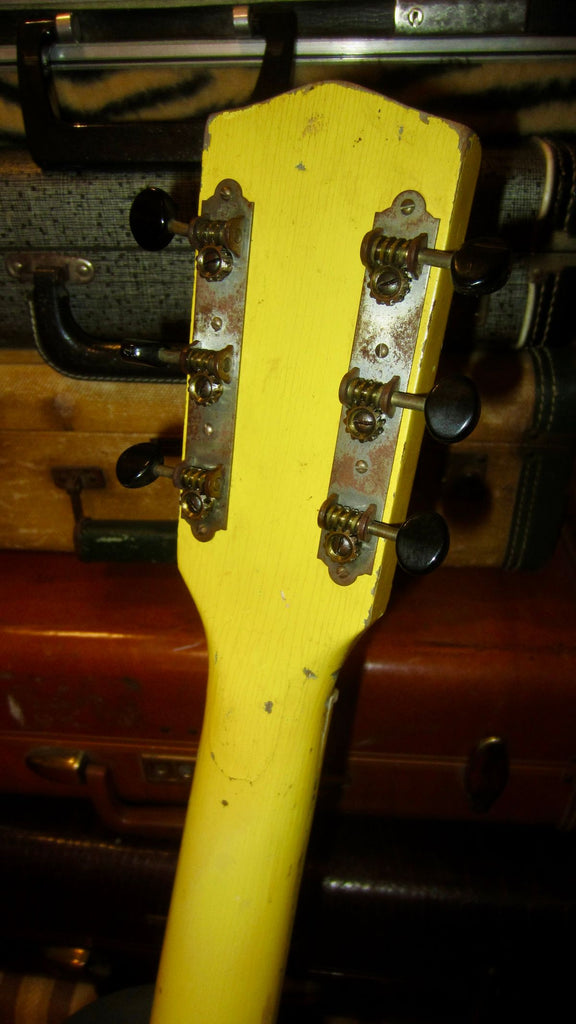 Super cool vintage solid body, one of the first, with a killer yellow finish and metal hubcap around the edge!