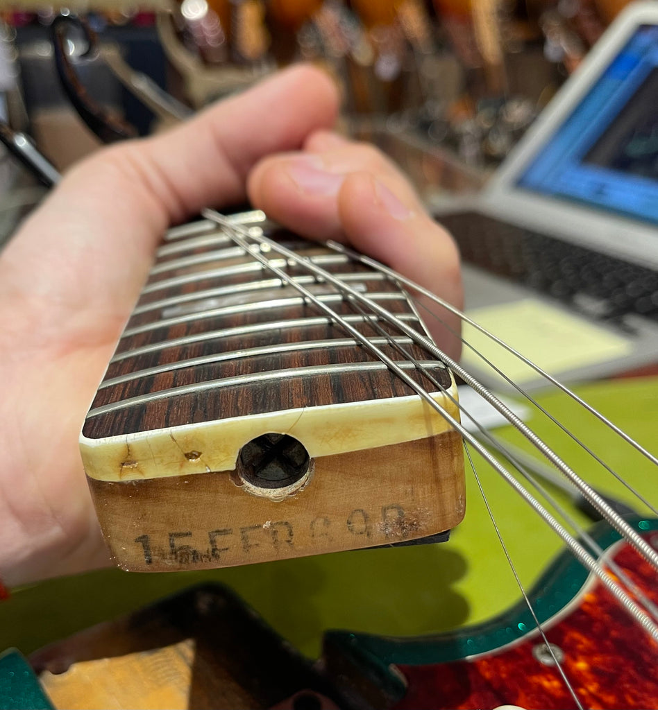 Neck is straight and plays with a good low action with no buzz or issues. Rosewood fretboard in excellent condition and so are the frets. Nice block inlays - a feature we dig.